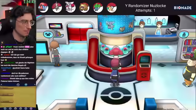 01:36:39Der Streamer betritt das Labor in Illumina City und fragt sich, warum er hierher soll, da er bereits ein Starter-Pokémon hat. Er erfährt, dass man hier einen Kanto-Starter bekommt, was ihn überrascht. Der Grund dafür ist die Mega-Entwicklung. Der Streamer kämpft und erreicht Level 16. Er setzt Stachler ein und entwickelt Bidifus. Professor Plath hat Shiggy, Glumanda und Bisasam. Der Streamer tauscht schnell und setzt Glut ein. Er überlegt, ob er Items hat, die er zu Beginn erhalten hat. Der Streamer wählt Terribug, um einen Glorognit zu erhalten. Er betritt ein Labor und erhält Luxusbälle. Der Streamer stellt fest, dass sich die Leute in der Story nicht mega entwickeln können, da er nicht die Pokémon hat, für die er die Steine bekommt. Er geht ins Café und trifft auf Kaffee und Vanitya. Der Streamer betritt Route 5 und trifft auf Tiano. Er kämpft gegen Lucario und erhält Bodycheck. Der Streamer findet einen Skatepark und versucht, ihn zu benutzen.