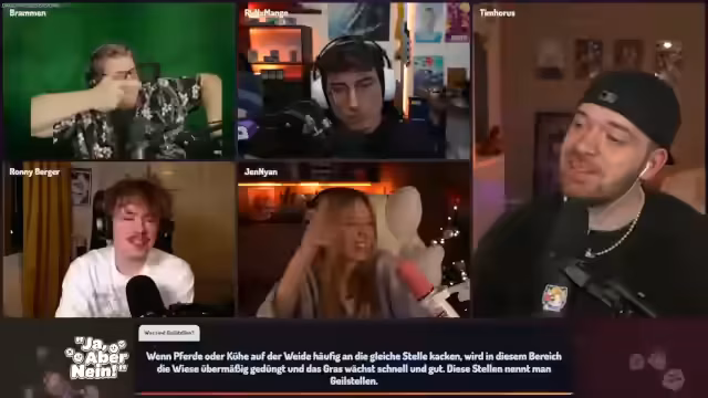 01:57:27Nach einer Frage zu 'Geilstellen' entwickelt sich eine Debatte über erogene Zonen. Die Teilnehmer spekulieren über subjektive und objektive Bedeutungen und landen schließlich bei einer landwirtschaftlichen Definition: Geilstellen sind Bereiche auf Weiden, wo Tiere häufig koten, was zu üppigem Graswuchs führt. Dies wird als metaphorische Erklärung für besonders fruchtbare Orte im Feld diskutiert.