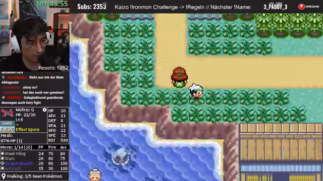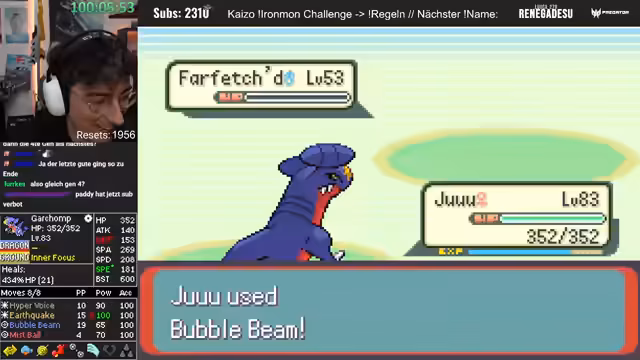 00:45:00Nach dem Quiz konzentriert sich der Streamer wieder auf das Hauptziel. Es wird die Route nach Floßbrunn und die umliegenden Gebiete abgegrast, um das Team zu stärken und wichtige Items wie Elixiere zu finden. Der Kampf gegen den letzten Trainer vor der Arena wird gezeigt und die Erkenntnisse über die zufälligen Gegnerstats werden diskutiert, die den Run im Late Game extrem gefährlich machen.