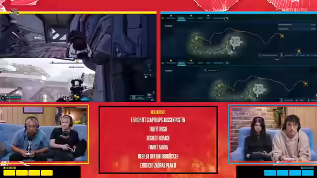 00:13:51Die erste Challenge des Abends ist ein Speedrun durch eine Story-Mission, bei dem die Teams versuchen, so schnell wie möglich bestimmte Meilensteine zu erreichen. Der Prolog wird übersprungen, und es gibt sechs Meilensteine, die es zu schaffen gilt, darunter das Erreichen von Claptraps Außenposten, das Treffen von Rush, das Besiegen von Horace, das Finden von Zedra, das Besiegen des Unterdrückers und das Erreichen von Zedras Plan B. Für das Team, das am Ende die meisten Meilensteine erreicht hat, gibt es fünf Punkte. Zusätzlich gibt es Bonuspunkte für jedes erreichte Level, wobei jeder Spieler pro Levelaufstieg einen Punkt zum Teamkonto beiträgt. Um die Fairness zu gewährleisten, dürfen keine Zwischensequenzen übersprungen werden, da dies mit Punktabzug geahndet wird. Die Teams bereiten sich darauf vor, mit Controllern zu spielen, was für einige eine zusätzliche Herausforderung darstellt.