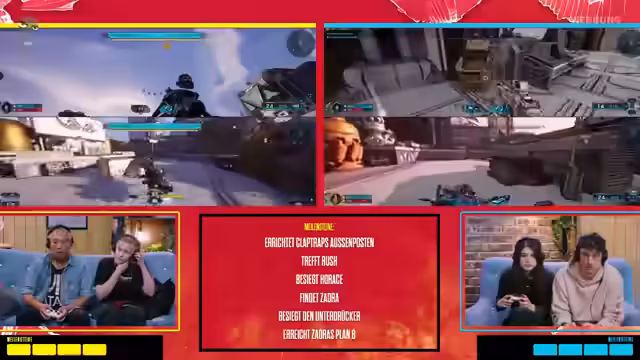 00:39:44Das Team nähert sich dem ersten Meilenstein, dem Erreichen von Claptraps Außenposten. Es wird diskutiert, ob der Meilenstein bereits erreicht ist oder ob noch weitere Aktionen erforderlich sind. Schließlich wird entschieden, dass beide Teams den Meilenstein erreicht haben und dafür einen Punkt erhalten. Der aktuelle Punktestand wird mit 2 zu 2 angezeigt, was bedeutet, dass beide Teams bisher gleichauf liegen. Die Teams konzentrieren sich darauf, Levelpunkte zu verteilen und sich auf die nächsten Herausforderungen vorzubereiten. Es wird auch überlegt, ob man Waffen kaufen sollte, aber dies wird als nicht sinnvoll erachtet, da die verfügbaren Waffen als minderwertig angesehen werden. Die Teams setzen ihren Wettkampf fort, indem sie versuchen, weitere Meilensteine zu erreichen und Level aufzusteigen, um ihren Punktestand zu verbessern.