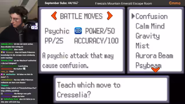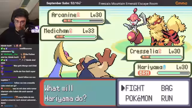 04:05:51Das Spiel erfordert, mehr aus Cresselia herauszuholen. Es wird vermutet, dass Ledian komplett nutzlos ist. Es wird überlegt, ob Ledian nicht reingewechselt werden soll. Es wird nochmals Follow Me eingesetzt. Was passierten, wenn wir jetzt Headlong Rushen? Dann sind wir einfach tot, weil jetzt fängst du an, wieder Dingens zu machen, ne? Oh nee, du Dark Pulse nochmal wieder. Interesting. Reicht aber. Akrobatik tötet dich mal. Ähm. Ist Armthrust zufällig ein Move, der AOE hat? Hat Hariyama irgendein AOE-Move, Leute? Drain Punch haben wir auch noch. Oh, Drain Punch könnte auch insane sein, actually. Die treffen alle nicht mehrere. Ist aber vielleicht dann vielleicht doch Drain Punch? Also Belly Drum ist es so oder so nicht. Aber dann... Cresselia Buffen ist, glaube ich, nicht das Play, oder? Special Attack, Special Death. Obwohl, was passiert, wenn wir das machen? Dann geben wir ihr Psychokinese natürlich wieder, I guess. Und dann ist die Idee, wir können mal ausprobieren, wir müssen auch ausprobieren. Also dann ist die Idee Follow Me und Calm Mind, oder was? Das Ding ist, wir müssen jetzt Bergrei töten, sonst ist Christelia tot. Und das schaffen wir nicht. Oder? Hat das Fee Vorteile auch nicht? Die Lösung besteht darin, Cresselia zu opfern, damit Brave Bird mehr Schaden verursacht und Arcani sich selbst umbringt. Es wird erkannt, dass Ledian nur Köder war. Der eine Kampf mit der Fluchscheiße, den fand ich schwieriger als den. Der war cool. Der war richtig cool. Ich hab von Anfang an gerochen, dass der machbar war.
