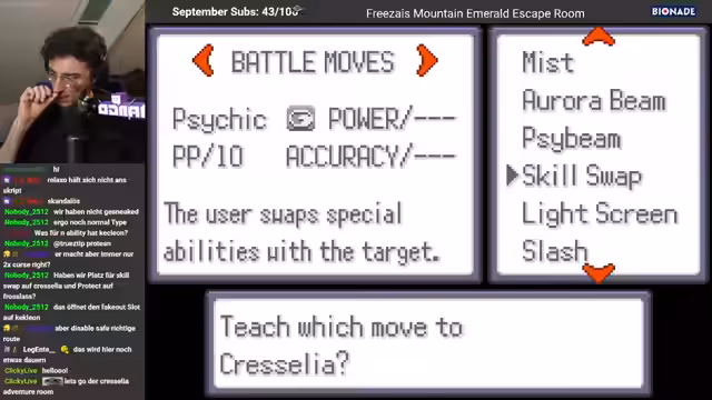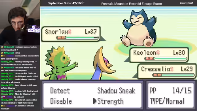 02:04:01Der Streamer verfeinert seine Strategie und überlegt, welche Attacken Kecleon und Cresselia einsetzen sollen. Es wird in Betracht gezogen, Detect auf Kecleon zu erlernen, um den Angriffen der Gegner auszuweichen. Der Streamer analysiert die Attacken der Gegner, insbesondere Curse und Body Slam von Relaxo, um die richtige Taktik zu entwickeln. Es wird festgestellt, dass Relaxo mehr Special- als Physical-Defense hat, was die Wahl der Attacken beeinflusst. Der Streamer überlegt, ob Psycho-Cut anstelle von Psy-Shock eingesetzt werden soll, da es von dem erhöhten Angriff profitiert. Es wird versucht, die Reihenfolge der Ereignisse zu verstehen und wie die Gegner auf die Aktionen des Streamers reagieren. Der Streamer experimentiert mit Shadow Sneak, um den Typ von Kecleon zu ändern und den Gegner zu verwirren.