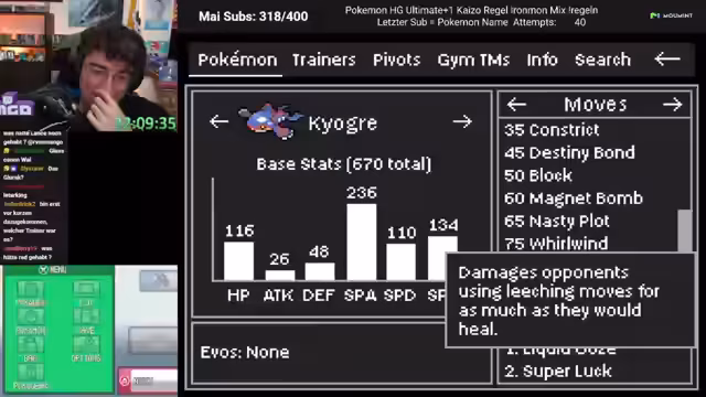 02:08:57Der Streamer analysiert die Werte von Keklion, das mehr Stats als Kadabra hat, was er als verrückt bezeichnet. Er stellt fest, dass dies für einen Keklion-Move sorgen könnte, aber auch die Herausforderungen durch Keg-Jogs hervorhebt. Er erwägt, das Pokémon absichtlich sterben zu lassen.