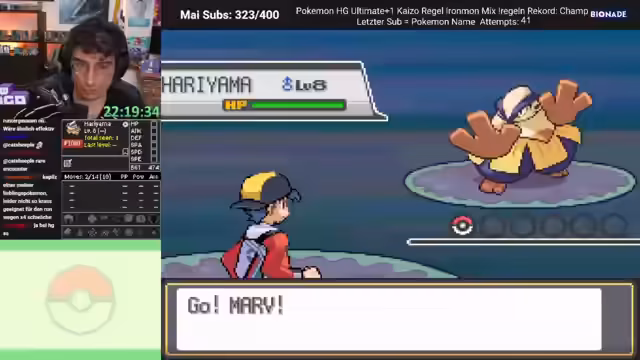 02:41:37Der Streamer betritt die Arena und muss verschiedene Trainer besiegen, um voranzukommen. Er nutzt Moves wie Walzer und Hyperfang effektiv, aber stellt auch fest, dass diese nicht immer treffen. Er muss Full Heals einsetzen und stellt fest, dass der Kampf schwierig sein könnte, vor allem wegen der geringen Genauigkeit einiger Moves.