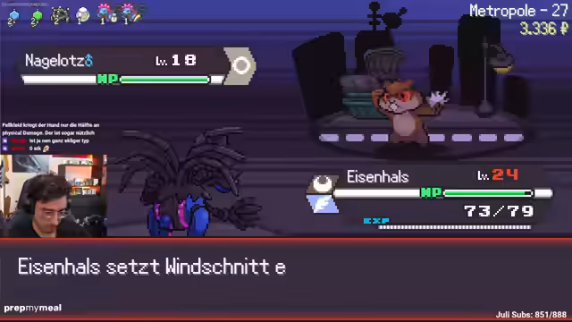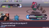 00:22:47Der Stream startet ein Spiel von Pokérogue, einem Pokémon-Roguelike. Nach einigen technischen Schwierigkeiten bei der Einrichtung der Kamera, wird das Gameplay gezeigt. Das Team besteht zunächst aus Eisenhals und Hundi. Der Streamer kämpft gegen mehrere Pokémon und Rivalen, fängt neue Teammitglieder wie Lapras und Tauros und sammelt Items. Er zeigt sich beeindruckt von den statistischen Werten einiger gefangener Pokémon und beschreibt den spielerischen Loop als süchtig machend.