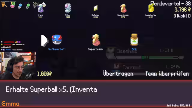 Es wurde ein Versuch unternommen, ein Pokemon-Roguelike zu meistern. Nachdem ein Arenaleiter besiegt werden konnte, wurde das Team in einem nachfolgenden Kampf geschwächt. Die anhaltenden Rückschläge und der Verlust von Teammitlichen führten dazu, dass der Run vorzeitig beendet wurde.