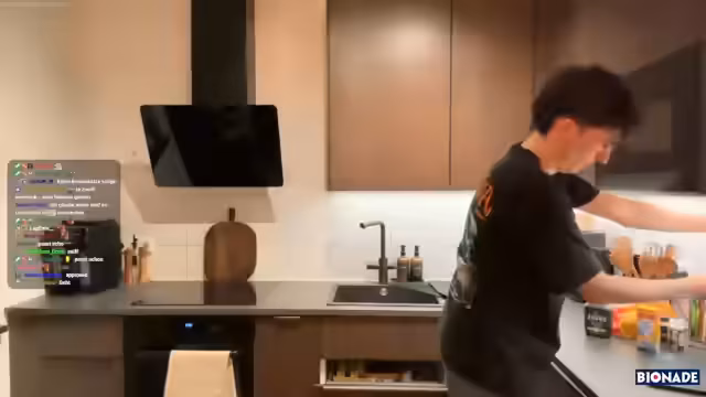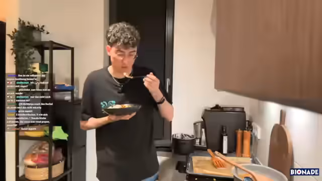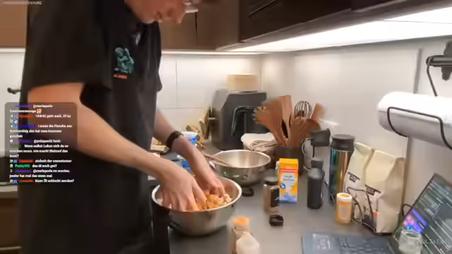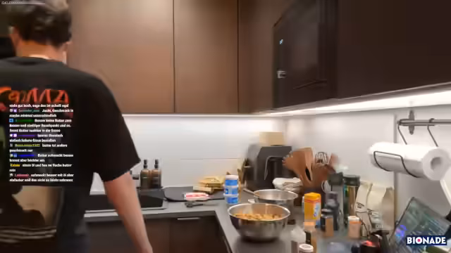00:15:00Vorstellung der Zutaten: Like Chicken (veganer Hähnchenersatz) wird aus Kostengründen (günstiger als tierisches Hühnchen) und ethischen Erwägungen gewählt. Kritik an Beyond Meat, Lob für Marken wie Planted. Bionade-Sponsoring für einen bevorstehenden Charity-Stream wird angekündigt. Die Küche wird als neu und ästhetisch beschrieben, aber die Kameraperspektive bereitet aufgrund der Körpergröße (1,93m) Probleme. Zutaten wie Gewürze, Parmesan und Cottage Cheese (Hüttenkäse) werden diskutiert.