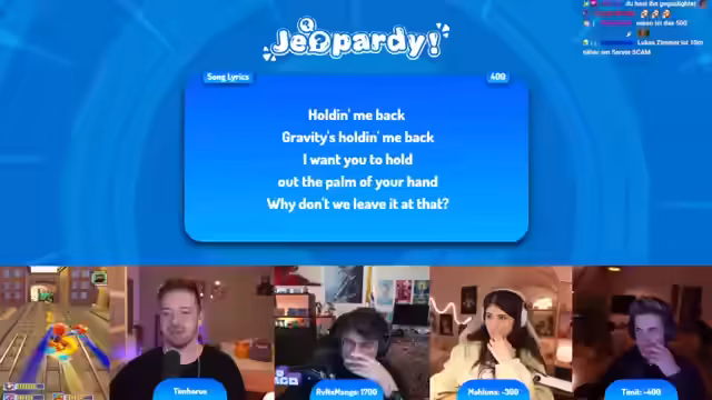 02:22:11Die erste Runde des Jeopardy-Quiz geht weiter mit einer Frage zu Pokémon Emojis 400, bei der die Teilnehmer ein Pokémon anhand von Emojis erraten müssen. Es folgt eine Schulfrage (Schule 100), bei der es um die Anzahl der Ballkontakte beim Volleyball geht. Mazat wählt Song Lyrics 500, aber die Teilnehmer haben Schwierigkeiten, den Song zu erkennen. Timmit entscheidet sich für YouTube-Titel 400, und die Frage bezieht sich auf eine Food-Challenge von Papa Platte. Lukas wählt Gaming 400, und die Frage dreht sich um das Erscheinungsjahr von League of Legends. Es gibt technische Probleme mit den Buzzern, und die Teilnehmer diskutieren über die Antworten. Am Ende des ersten Boards gibt es ein Zwischenergebnis, und die Teilnehmer bereiten sich auf das zweite Board mit neuen Kategorien und doppelten Punkten vor.
