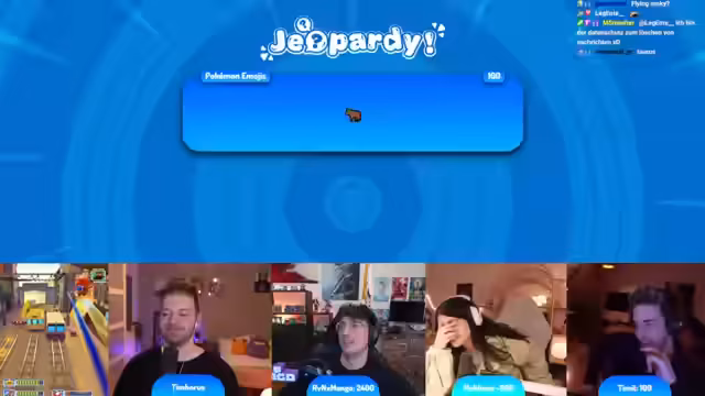 02:50:21Das Jeopardy-Spiel geht weiter mit der Kategorie Gen Alpha Slang 600, bei der die Teilnehmer erklären müssen, was ein Bob ist. Lukas gibt die richtige Antwort. Timmit wählt Twitch-Kategorie 200 und muss eine Kategorie anhand von Emojis erraten. Lukas entscheidet sich für Astronomie 200 und beantwortet die Frage nach dem Planeten, der der Sonne am nächsten ist, korrekt. Mazat wählt Anime schlecht erklärt 200, und die Teilnehmer müssen einen Anime anhand einer schlechten Erklärung erraten. Timmit entscheidet sich für Anime 600, und die Frage bezieht sich auf den Anime Bluelock. Lukas wählt Welches Tier bin ich? 200, und die Teilnehmer müssen ein Tier anhand von Beschreibungen erraten. Die Fragen werden schwieriger, und die Teilnehmer haben Spaß beim Rätseln und Diskutieren der Antworten.