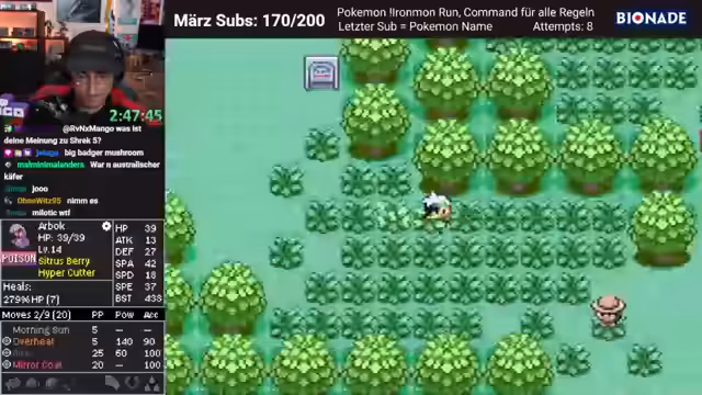 02:58:45Ein Raid wird begrüßt und das Pokémon-Arc erklärt. Es wird Ironmon gespielt, eine Mischung aus Regeln und Rom-Hack. Alles im Spiel ist random: Pokémon, Trainer, Attacken, Items und Stats. Wenn ein Pokémon stirbt, ist es für immer tot. Auf jeder Route darf nur ein Pokémon gefangen oder besiegt werden. Trainer haben 50 Prozent höhere Level. Die Regeln sind im Chat mit !Ironman verfügbar. Es ist der achte Versuch, das Spiel durchzuspielen. Es wird Standard-Iron-Mon gespielt. Der Gambling-Aspekt des Spiels wird gemocht. League of Legends wurde aufgegeben. Ein Hauptkanal-Video wird über einen erfolgreichen Feuerrot Ironmon-Run gemacht. Der Therapeut hat vorgeschlagen, mit LOL aufzuhören. Dieselbe Route darf nicht nochmal gefangen werden. Absol wird als cool und Mega Absol als elegant bezeichnet. Der Name Türke wird erklärt. Eine Schlange macht mit einem Biss fast ein Pokémon weg. Nuzlocke werden als lame bezeichnet, da man die ganze Zeit wilde Pokémon hochgrindet. Die Entwicklungen sind random. Kaiser Iron Man wird als zu schwer angesehen. Türkic erhält Hitzekoller. Die Random Stat-Verteilung wird als problematisch angesehen. Porygon stirbt und die Shell-Belle geht kaputt. Es wird überlegt, einen Trainer zu machen, um vorzubeugen. Spiegelscape funktioniert als zweites. Es wird ein Big Mushroom gefunden. Ein komischer Käfer wird erwähnt. Es wird erklärt, wie viele Encounter auf einer Route gesehen wurden. Es wird entschieden, jeden Encounter anzusehen. Legendaries dürfen nicht benutzt werden, es sei denn, sie entwickeln sich in eines oder sind in der Favorite-Clause. Es wird ungeduldig auf den sechsten Encounter gewartet. Level 12 Milotic wird gefangen. Moonwolf hat sich einen neuen Account gemacht, um den Namen zu bekommen. Die Werte von Moonwolf werden überprüft. Milotic hat gute Moves: Heatwave, Frenzy, Pledge, Shadowball, Irontail. Ein Doppelwasser-Kampf steht bevor. Milotic wird von ISIS-Kälte besiegt. Es wäre kein Encounter mehr verfügbar gewesen. Es ist Attempt Nummer 9. Ein Milotic wird erneut gefangen. Die Stats sind besser. Die Fähigkeit ist Minus. Donnerblitz wird eingesetzt. Flinch wird eingesetzt. Decks, Balls, Shoes werden gegeben. Die Rotation von Iron Man wird gezeigt. Die Wahrscheinlichkeit, Milotic erneut zu bekommen, wird berechnet. Es wird überlegt, ein Hundemon zu fangen. Anime Suchti wird gefangen. Mit der Mutter muss geredet werden. Lapras wird als hot bezeichnet. Le Mau rettet den Run. Anime wird eingesetzt, stirbt aber. Hundemon stirbt. Milotic levelt langsam.