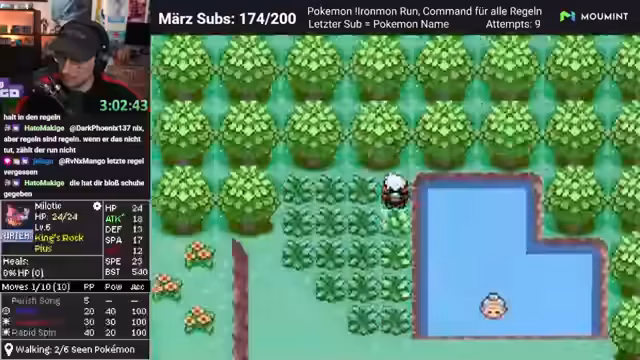 03:20:12Nachdem alle sechs verfügbaren Wild-Encounters auf einer Route gesehen wurden, wird ein Milotic gefangen. Das Pokémon hat ein starkes Moveset mit Heatwave und Shadow Ball, aber auch eine problematische Fähigkeit (Minus). Trotz dieser Schwäche wird es als Hoffnungsträger in das Team aufgenommen, da die Stats insgesamt besser sind. Der Streamer ist euphorisch über diesen zweiten Versuch und sieht es als reines Schicksal an.