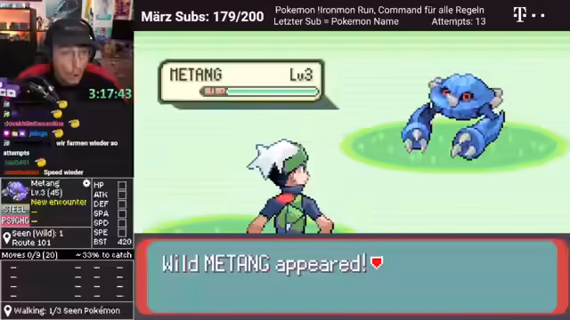 03:48:20Der Streamer erlebt eine Achterbahn der Gefühle, als er sich in ein Pokémon verliebt, aber dann von einem anderen besiegt wird. Er entscheidet sich für ein Metagross, das er aufgrund einer speziellen Klausel in seinen Favoriten hat. Die Freude währt jedoch kurz, da sich herausstellt, dass das Metagross schlechte Werte und Moves hat. Es wird diskutiert, ob die Wahl des Metagross Glück oder Pech war, da ein anderes Pokémon potenziell besser gewesen wäre. Der Streamer nimmt ein Altaria als Ersatz ins Team auf. Es folgen weitere Kämpfe und Begegnungen, darunter ein Libiskus mit der Fähigkeit Shell-Armor und ein Radfratz mit Kraftkoloss. Der Streamer stellt fest, dass er schon lange keinen Rivalen mehr besiegt hat und spammt Smogscreen in einem Kampf. Er erhält Celebi, was er als Glück bezeichnet.