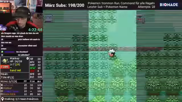00:23:51Der erste Run in Smaragd Ironmon beginnt mit Lugia als Starter und einem Slugma namens Izek. Es wird kurz überlegt, ob der letzte Run zu glücklich war, was die Entscheidung beeinflusst, nicht direkt in den Ultimate Iron Man-Modus zu starten. Stattdessen wird beschlossen, Standard zu spielen und bei Bedarf später auf schwierigere Varianten wie Feuerrot Kaizo umzusteigen. Der erste Kampf gegen den Rivalen endet jedoch schnell mit dem Tod von Izek durch Waterpulse. Ein neuer Run wird gestartet, diesmal mit Voltoball namens Karl Lamorgut. Es wird überlegt, ob Battlemusik gespielt werden soll und die Attacken werden neu gelernt. Ein Visenio wird besiegt, um ein Level aufzusteigen und die Chancen gegen Michael zu verbessern. Trotzdem scheitert der Run erneut, als das Voltoball gegen Galoppa verliert.