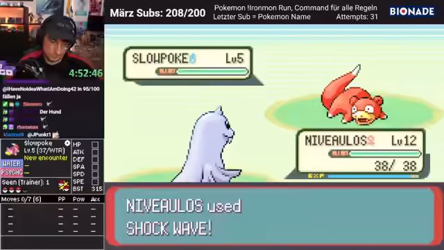 00:20:50Nach dem Start von Pokémon Smaragd wird das Team zusammengestellt. Der Starter ist das stark zufällige Pokémon Lugia. Der Streamer kämpft erfolgreich gegen den Rivalen und nutzt gezielt wild Encounters, um sich Level zu verschaffen. Insgesamt ist er sehr zufrieden mit dem Start und dem zufällig erhaltenen Team, das bereits im Early-Stage sehr starke und effektive Pokémon wie den Sengo mit Blizzard enthält.
