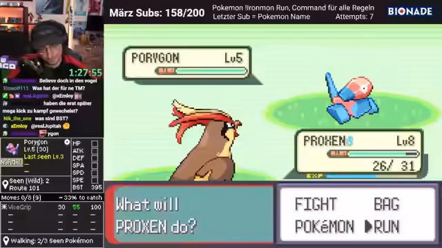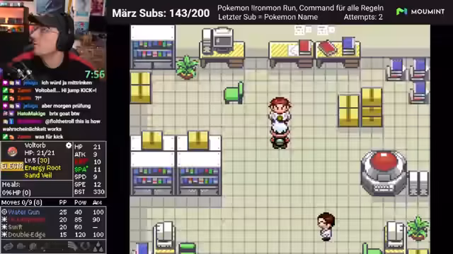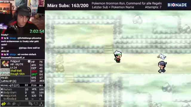 02:00:22Ein glücklicher Fang, der Frosch Freaky, bringt neue Hoffnung. Kurz darauf erleidet jedoch das bisherige Team, einschließlich des starken Taubos, durch einen Trainerkampf schwere Verluste. Der Run ist akut gefährdet. Der Streamer analysiert, welche Pokémon auf den Routen verpasst wurden (wie Libeldra und Metagross), und beschließt, für die Zukunft strikt alle verfügbaren Wild-Encounters zu prüfen, um keine starken Pokémon zu übersehen. Ein neuer Versuch startet mit einer Notlösung, dem gefangenen Porygon, das sich jedoch als problematisch erweist, da es nur eine Attacke hat.