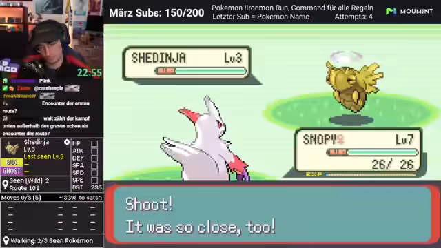 00:57:03Es wird festgestellt, dass das Besiegen von Trainern auf der Route zum Weiterkommen führt. Ein Charnera mit Drizzle wird in Betracht gezogen, aber verworfen. Ein Hydropie wird gesucht, aber nicht gefunden. Stattdessen wird ein Schwalbini gefangen und Cat-Cheap genannt. Ein Dratini wird besiegt. Ein Porygon 2 wird zum Problem und das Team wird von einem wilden Ho-Oh auf der zweiten Route ausgelöscht. Der Streamer zeigt sich enttäuscht über das frühe Aus und die vielen Ja-Stimmen bei der Wette über Sengus Ableben. Ein Seaking wird gefangen, aber als unbrauchbar eingestuft. Ein Simsoro wird gefangen und Simsoro genannt, aber auch dieser wird als kacke bezeichnet.