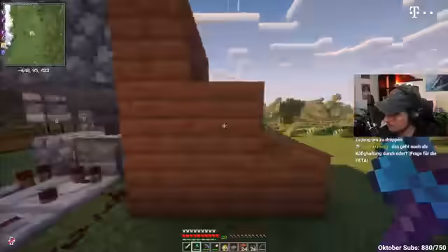 02:56:04Der Bau der Chicken Farm erweist sich als technisch fordernder als erwartet. Es mangelt an Ressourcen wie Redstone und Netherquarz, was zu einer taktischen Risikoabschätzung führt. Der Streamer reist daher für die benötigten Materialien in den Nether. Nach der Rückkehr beginnt der Zusammenbau der Farm aus Cobblestone, Trichtern, Dispensern und Redstone-Komponenten, wobei der Fokus auf einer simplen und funktionalen Lösung liegt.