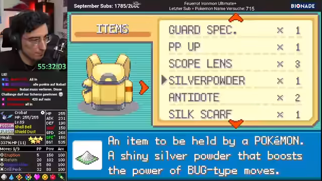00:07:28Ein bemerkenswerter Fortschritt wird verzeichnet, als es gelingt, eine ganze Reihe von Trainern ohne Heilung zu bewältigen, ein Novum im laufenden Run. Dies wird dem Pokémon X-Bat zugeschrieben, dessen Wirken als so effektiv beschrieben wird, dass es das Gameplay komplett verändert. Wichtige Items wie Shell-Bell und Borussia-Nel gefunden und die strategische Bedeutung von Drillpack für zukünftige Kämpfe diskutiert.