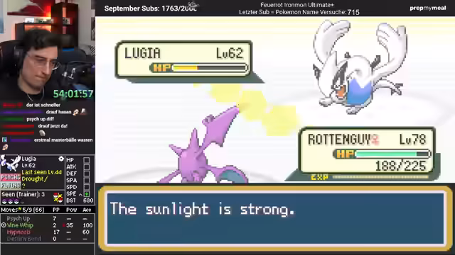 02:58:00Der Run nähert sich seinem Ende und der Streamer priorisiert das Sammeln der letzten Items und das Vorbereiten seines Teams für die finalen Kämpfe. Es werden strategische Entscheidungen getroffen, wie die Verwendung von Sonnenbombons und die Verwaltung von Hyperheilern. Die Situation ist prekär, da eine weitere Destiny Bond-Attacke von Mewtwo zum Laufende des Spiels führen würde. Es besteht der Plan, nach dem aktuellen Kampf die letzte XP zu sammeln und sich dann endgültig auf die Poké-Liga vorzubereiten, um den Run erfolgreich abzuschließen.
