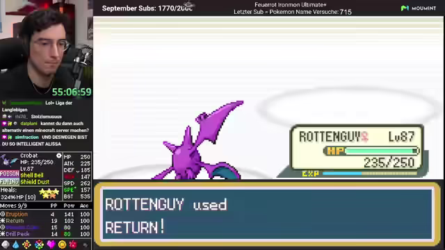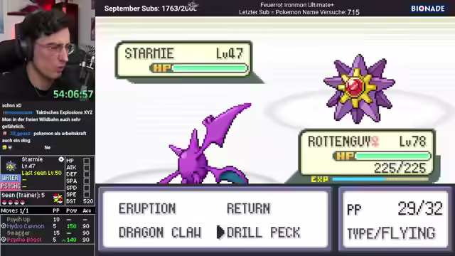 03:20:36Die Top 4 Kämpfe in Pokémon Feuerrot gestalten sich als unerwartet schwierig, da die Gegner vermehrt kritische Treffer landen, was den Schwierigkeitsgrad deutlich erhöht. Um dies zu kompensieren, setzt der Streamer auf taktische Flöten-Einsätze, um sich Vorteile zu verschaffen und den Ausgang der Kämpfe zu beeinflussen. Im finalen Kampf gegen den Champ muss er sich auf Drillpack verlassen und Lovely Kiss Attacken kontern, um nicht paralysiert zu werden. Durch geschicktes Heilen und den Einsatz von Items wie Hyper Potions und Blauflöten gelingt es, kritische Situationen zu überstehen. Der Einsatz von Schwerttanz und Drillpack erweist sich als entscheidend, um den Gegner zu besiegen und einen neuen Rekord aufzustellen. Trotz des hohen Schwierigkeitsgrades und der unerwarteten Wendungen behält der Streamer die Nerven und passt seine Strategie kontinuierlich an, um den Sieg zu erringen.