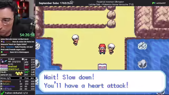 02:40:35Es wird diskutiert, wann die ersten Gamer in ein Alter kommen, in dem das Altenheim-Gaming relevant wird. Die erste Generation, die viel Zeit mit Gaming verbracht hat, ist etwa zehn Jahre jünger als der Streamer. Es wird geschätzt, dass die erste Generation, die so richtig versunken ist im Gaming, zwischen 1988 und 1990 geboren wurde. Der Streamer macht eine Warteliste für sein Altersheim auf und plant, schlechte 3D-Animationen des Gebäudes zu erstellen. Er bittet um eine Anzahlung von 45.000 Euro pro Person. Der Streamer fragt sich, ob Aquahaubitze assisted hat. Er bietet einen Affiliate-Link für sein Altersheim an. Er schlägt einen Gamble mit Gifts vor. Der Gamble wurde leider verloren. Mit den Gifts sind sie einfach gerade aus der Krise rausgekommen. Es wird festgestellt, dass O-Mot ein gutes Pokémon ist. Der nächste Run-Ending-Fight steht direkt vor der Tür wieder. Crunch könnte eine Option sein. Eruption ist ein bisschen outdated, seitdem Drillpack vorhanden ist. Der Rivale ist sehr machbar. Es wird überlegt, ob Eruptionen noch irgendeinen Sinn haben. Es wird über das Move-Set diskutiert. Der Streamer heilt sich. Er ist das erste Mal hier mit One-Shot-Dungeons. Sie sollen erstmal wieder alle Item sein. Und machen uns den Weg zum Ende frei. Und dann machen wir so viele Trainer, wie wir können.