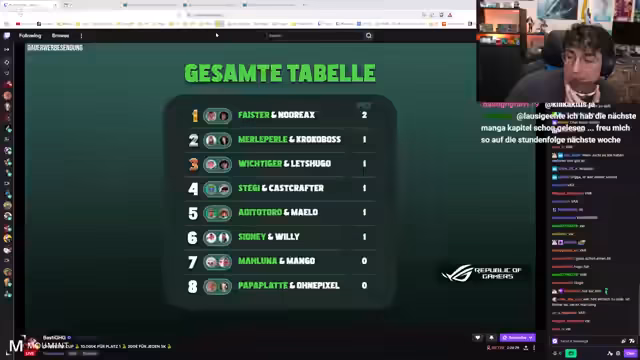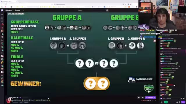 01:20:03Nach technischen Vorbereitungen wie der Kameraintegration beginnt das Turnier mit den ersten Matches in der Gruppenphase. Krok und Merle treten als erstes Team in Gruppe A an. Die Regeln sehen vor, dass während der Spiele der Chat aktiv bleibt, aber Emote Only aktiviert wird. Die Teams sind einigermaßen vorbereitet, einige haben intensiv trainiert, während andere spontan teilnehmen. Die Atmosphäre ist nervös und aufgeregt, da das Preisgeld von 10.000 Euro auf dem Spiel steht.