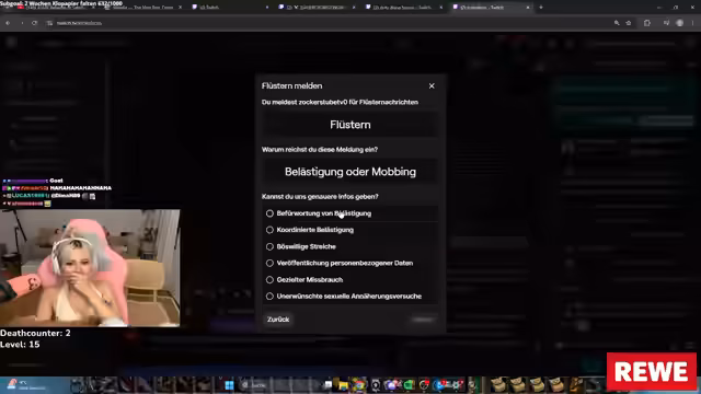 12:11:38Die Streamerin und ihre Gruppe machen erhebliche Level-Fortschritte, wobei sich besonders ihr Charakter und der von 'Chico' schnell entwickeln. Dies führt zu einem 'Race', um den Vorsprung eines anderen Spielers, Max, aufzuholen. Die Streamerin teilt auch persönliche, frustrierende Erlebnisse aus ihrem Hardcore-Spiel, die den 'Fickpilz'-Namen inspiriert haben, und diskutiert die Suchtgefahren bei intensivem Spielen.
