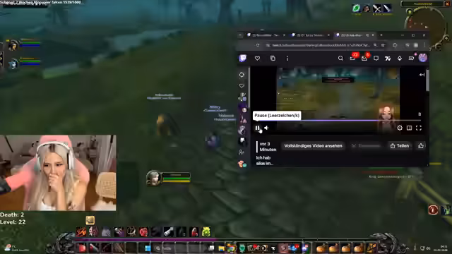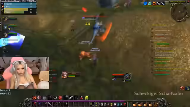 01:36:53Die Streamerin findet endlich einen Partner für den Silvesterabend: Rajo. Sie fliegt zu ihm nach Westfall, um zusammen zu spielen und zu leveln. Sie haben ein gemeinsames Ziel: das Absolvieren der Quest nach dem scharfen Clown. Rajo ist ein erfahrener Spieler, der ihr hilft, die Quest zu meistern. Sie lachen über die Missverständnisse und arbeiten gut zusammen, um die Gegner zu besiegen und die Quest zu beenden.
