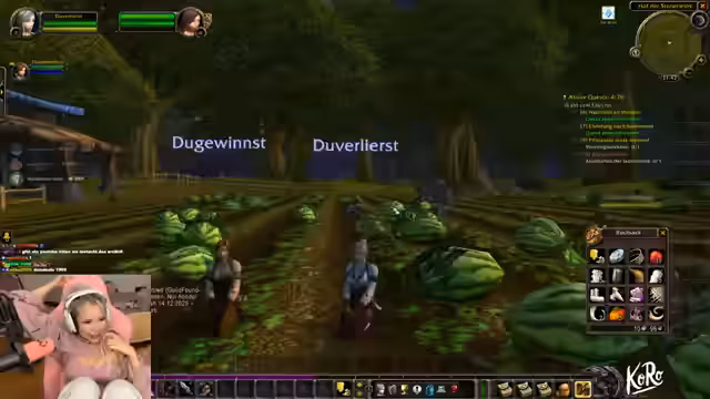 00:40:29Han gibt Sarah detaillierte Tipps für ihren Rogue-Charakter. Er erklärt Stealth-Mechaniken und rät dringend von Dagger-Skills ab, da NPC-Mobs frontal angreifen – stattdessen empfiehlt er Schwerter. Sarah kämpft mit Quest-Verwaltung und Labyrinth-Strukturen, während Han sie durch Goldshire navigiert. Sie diskutieren über ihre Erfahrungen mit anderen Klassen wie Jäger und Druide.