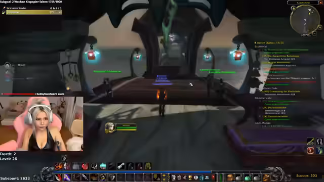 09:11:32Die Streamerin äußert ihre Zufriedenheit mit den Zuschauern, die bei Quests helfen, und sucht gezielt nach bestimmten Quests. Sie erwähnt ihre Schwierigkeiten, den Schlossknacken-Skill zu verbessern, was ihr übelst kacke erscheint. Trotz ihrer Erfolge beim Leveln im Gebiet Ashenvale fühlt sie sich oft ängstlich und überfordert. Sie sucht nach Spots zum Questen, da sie Angst hat und sich in der Welt nicht sicher fühlt, und benötigt Hilfe bei der Orientierung.