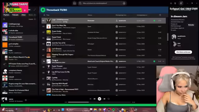 00:01:36Die Streamerin äußert ihre Abneigung gegen den Winter und die damit verbundenen Depressionen, die sie aktiv bekämpfen möchte. Sie plant, ein volles Programm durchzuziehen, um nicht in eine depressive Stimmung zu verfallen, und betont, wie sehr sie den deutschen Winter hasst. Während sie auf ihr Essen wartet, das ihre Stimmung heben soll, wird ein Spotify-Jam gestartet. Es gibt anfängliche Schwierigkeiten, den Jam richtig einzurichten und den Sound für alle hörbar zu machen. Die Streamerin bestellt chinesisches Essen und Pizza, und es kommt zu einer Diskussion über Essgewohnheiten, insbesondere wie man Pizza isst, was zu humorvollen Auseinandersetzungen mit dem Chat führt. Die technische Einrichtung des Spotify-Jams erweist sich als kompliziert, da der Link nicht direkt im Stream gezeigt werden darf und der Sound nicht sofort bei allen Teilnehmern ankommt. Trotz der Herausforderungen wird schließlich Musik abgespielt, beginnend mit Weihnachtsliedern, was die Stimmung im Stream auflockert und zu weiteren Interaktionen mit dem Chat führt.