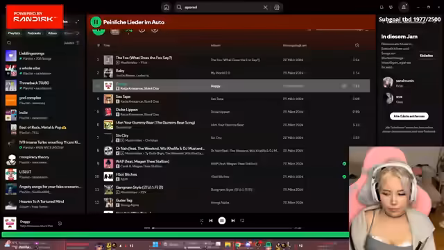 00:24:00Die Streamerin und ihr Publikum unterhalten sich über verschiedene Musikrichtungen und Songs. Es wird versucht, verschiedene Lieder abzuspielen, was jedoch zu weiteren technischen Problemen führt. Die Streamerin erzählt Anekdoten über ihre Kindheit und wie sie bestimmte Songtexte falsch interpretiert hat, was zu amüsieren Reaktionen im Chat führt.