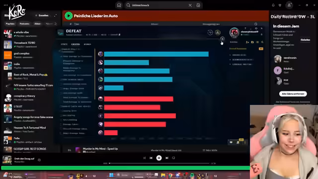 01:14:14Die Streamerin und ihr Duo-Partner versuchen, das League of Legends-Spiel zu gewinnen, während die musikalische Untermalung des Streams weiterhin für Abwechslung sorgt. Es kommt zu einer Diskussion über einen Song, der Kindheitserinnerungen weckt, aber auch als übergriffig empfunden wird. Die Streamerin teilt humorvolle Gedanken darüber, wie es wäre, einen Penis zu haben und die damit verbundenen Herausforderungen, was zu weiteren Lachern im Chat führt. Es wird über Rollenspiele und die Dynamik zwischen Discord-Mod und Discord-Kitten gesprochen, wobei die Streamerin und ihr Duo-Partner humorvoll in diese Rollen schlüpfen. Diese spielerischen Interaktionen und persönlichen Anekdoten tragen zur lockeren und unterhaltsamen Atmosphäre des Streams bei. Trotz der Schwierigkeiten im League of Legends-Spiel bleibt die Stimmung positiv und interaktiv, während die Streamerin und ihr Duo-Partner weiterhin versuchen, das Beste aus der Situation zu machen.