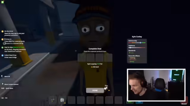 00:10:26Nachdem der Streamer keine aktuelle Videoschiene findet, beginnt er mit dem Spiel Schedule 1, in dem man als Drogendealer in einer US-amerikanischen Kleinstadt agiert. Er startet in schwierigen Umständen ohne Geld oder Kontakte und versucht, durch erste Deals mit Kunden wie einem minderjährigen Basketballer und dem unzuverlässigen Karen anfangen zu kommen, stößt aber schnell auf technische und strategische Herausforderungen.