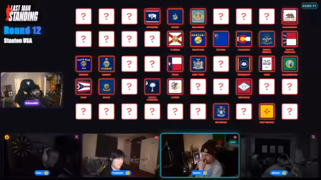 00:12:45Die erste Kategorie des Quizspiels wird vorgestellt: US-Bundesstaaten. Die Teilnehmer müssen nacheinander einen Bundesstaat nennen. Bei einer falschen Antwort scheidet der Spieler direkt aus. Hui beginnt mit New York, gefolgt von Sascha mit Kalifornien und Rohat mit Nevada. Fabo nennt Florida, und Sascha fügt Wyoming hinzu. Die Runde wird intensiver, als Rohat Orlando nennt, was jedoch kein Bundesstaat ist und zu seinem Ausscheiden führt. Die verbleibenden Spieler nennen weiterhin Staaten wie Ohio, Montana, New Mexico, Arkansas, Mississippi, Washington, Colorado, Oregon, Iowa, Illinois, South Carolina, North Dakota, North Carolina, Delaware, Michigan, Idaho, South Dakota und Connecticut. Am Ende der Runde werden die Punkte vergeben, wobei Hui vier Punkte erhält und Sascha einen Punkt.