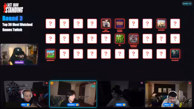 00:23:10Die nächste Kategorie des Quizspiels konzentriert sich auf die meistgesehenen Spiele auf Twitch in den letzten sieben Tagen, basierend auf den Top-30-Kategorien. Hui beginnt mit Minecraft und Just Chatting, gefolgt von Sascha mit Fortnite und Fabo mit League of Legends. Valorant wird ebenfalls genannt. Rohat scheidet aus, nachdem er Mario Kart nennt, was nicht in den Top 30 ist. Die Diskussion dreht sich um mögliche Spiele und Kategorien wie Battlefield 6 (was als zu alt für die Top 7 Tage befunden wird), Counter-Strike und Slots. Die Runde endet mit der Erkenntnis, dass viele der genannten Spiele nicht in den aktuellen Top-Charts vertreten sind, und die Spieler kämpfen, um gültige Antworten zu finden, was die Schwierigkeit der Kategorie unterstreicht.