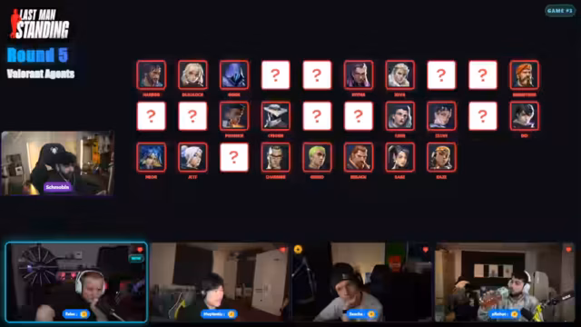 00:27:34Die Quizshow geht weiter mit der Kategorie 'Valorant Agents'. Sascha beginnt die Runde mit Reina, gefolgt von Raze und Jett. Neon, Phoenix, Cypher, Omen, Deadlock, Chamber, Brimstone, Kayo, Sage, Sova, Gekko, Harbor, Fade und Breach werden ebenfalls genannt. Die Spieler versuchen, sich an weitere Agenten zu erinnern, wobei einige Schwierigkeiten haben, die Namen der neueren oder weniger bekannten Charaktere zu nennen. Die Runde wird intensiv, da jeder versucht, nicht auszuscheiden. Am Ende werden weitere Agenten wie Killjoy, Viper und Yoru erwähnt, die von den Teilnehmern vergessen wurden. Diese Kategorie erfordert detailliertes Wissen über das Spiel Valorant und seine Charaktere.