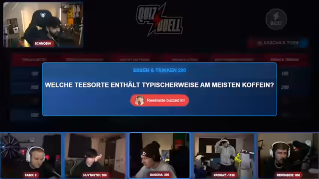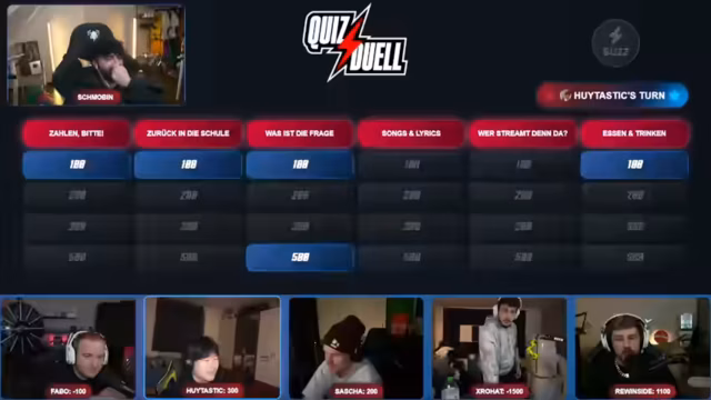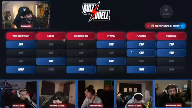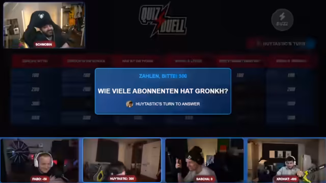00:44:20Nach dem ersten Quizspiel wird ein zweites Spiel gestartet, das ein anderes Format hat. Die Teilnehmer wählen nacheinander eine Kategorie aus, wobei 100 Punkte leichtere Fragen und 500 Punkte schwerere Fragen bedeuten. Bei einer falschen Antwort werden die Hälfte der Punkte abgezogen, und andere können buzzern. Robin erklärt die Regeln, einschließlich der Verwendung der Leertaste oder eines Buzzers auf dem Bildschirm. Es wird erwähnt, dass es auch ein zweites Board mit doppelten Punkten und anderen Kategorien gibt. Fabo beginnt mit der Kategorie 'Wer streamt denn da?' für 200 Punkte. Die erste Frage betrifft einen Streamer, der Norex ist, was korrekt beantwortet wird. Die nächste Frage aus der Kategorie 'Zurück in die Schule' für 300 Punkte fragt, welcher Bruch größer ist: zwei Drittel oder 3,5, wobei zwei Drittel korrekt ist. Die Quizshow geht weiter mit Fragen zu Songtexten und Zahlen, wobei die Schwierigkeit der Fragen zunimmt.