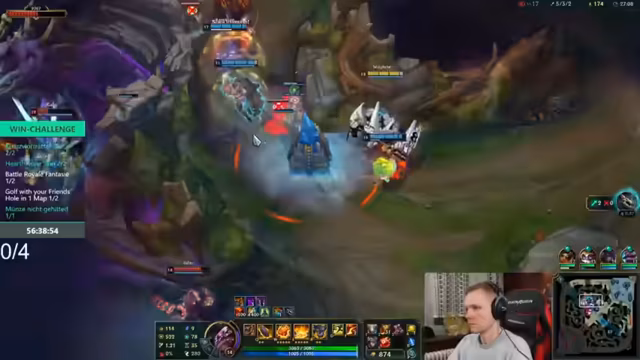 03:34:21Das Gameplay der Challengerunde ist von intensiven Kämpfen und Champions wie Gangplank und Diana geprägt. Der Streamer kommentiert spielerische Entscheidungen und Erfolge, wie einen gelungenen Gangplank-Einsatz. Es wird auch auf die Leistung der Gegner eingegangen, darunter ein starkes gegnerisches Team, das ein Prime League D4-Roster darstellt. Der Fokus liegt auf dem Champion-Aufbau und der Itemisierung, wie die Wahl zwischen Plated Steel Caps oder Mercury's Treads.