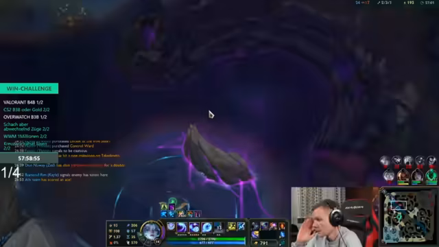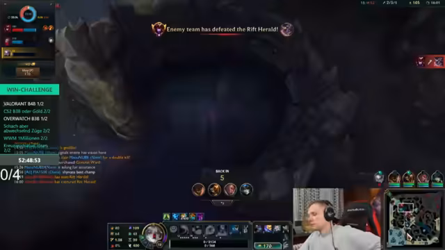 06:49:16Das anspruchsvolle League of Legends-Spiel geht weiter. Das Team befindet sich in einem prekären Zustand, mit Ressourcenproblemen und muss defensiv spielen, um den gegnerischen Baron Nashor zu verhindern. Der Streamer analysiert die Situation, gibt Anweisungen für das Farmen und Visionkontrolle, aber das Spiel bleibt chaotisch und voller unvorhergesehener Manöver. Der Gegner agiert sehr koordiniert, was für das Team schwer zu kontern ist.