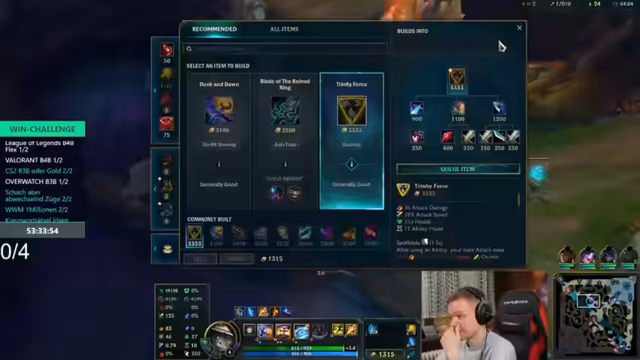 04:54:47Zu Beginn des Segments stehen strategische Spielentscheidungen im Fokus. Der Streamer diskutiert das Item 'Essence' als Lösung für ein Mana-Problem, wodurch man mehr Schaden verursachen kann. Es werden verschiedene Item-Builds wie 'Full-Crit' mit 'Infinity' und 'Whitsand' mit 'Sonja' als Alternative besprochen. Die Gesprächsrunde bewertet auch den Nutzen von 'Witz's End' für die Itemisierung und analysiert die Map-Positionierung, um gegnerische Aktionen wie das Clearen einer Welle zu bestrafen. Der Fokus liegt auf der itemabhängigen taktischen Flexibilität.