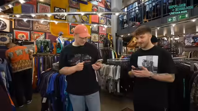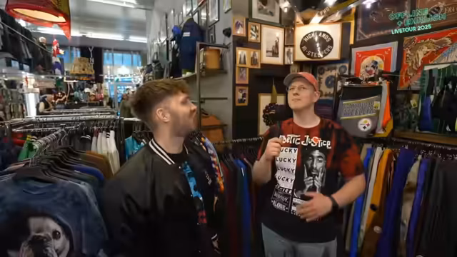 00:55:22Der Streamer beginnt mit der Suche nach einem authentischen Eminem-Outfit, inspiriert von dessen klassischem Stil, bestehend aus ultra-baggy Hosen und oversized weißen T-Shirts. Er schildert die Herausforderung, passende XL-Größen in einem Vintage-Laden in Hamburg zu finden, und erkundigt sich gezielt nach Latzhosen, die ein zentrales Element des Looks sind. Gemeinsam mit Philipp und Max durchstöbert er die Abteilungen, probiert eine Holzfällerhemd-Jacke an und diskutiert intensiv mit Chat und Team über die perfekten Kombinationen. Es geht weniger um reine Merchandise-Stücke, sondern um die Interpretation des Eminem-Looks mit den vorhandenen, Vintage-Stücken.
