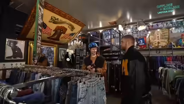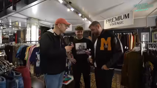 01:35:51Nachdem Max ein perfektes Ensemble aus einer Arbeitsplatzhose und einer passenden Jacke gefunden hat, endet die Shoppingtour. Der Streamer und das Team präsentieren ihre Finalen Outfits, die sie für die Tour tragen werden, und preisen den Vintage-Laden 'Vintage & Rags' in Hamburg, der eine coole Atmosphäre und ein breites Angebot bietet. Abschließend wird der Einkauf noch einmal als überwältigend, aber erfolgreich beschrieben und den Zuschauern der Laden für einen Besuch empfohlen.