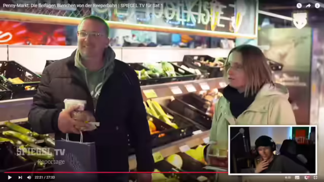 01:04:11Der Streamer schaut sich einen Clip aus einem Reeperbahn-Discounter an und ist überrascht von den skurrilen Szenen und der Normalität des Alltags dort. Er lobt die Melodie, die Bilder und die Geschichten der Menschen, die dort zusammenkommen, erwähnt aber auch die traurige Realität von Alkoholismus. Der Penny-Markt wird als Sehenswürdigkeit beschrieben. Es wird kurz über den Umgang mit Alkohol als Droge gesprochen und die hohen Kosten für Wocheneinkäufe thematisiert, wobei die Ausgaben für vegane Produkte besonders hervorgehoben werden. Der Streamer fragt nach den wöchentlichen Ausgaben der Zuschauer für Lebensmittel und kommentiert unterschiedliche Angaben. Abschließend wird über die hohen Preise für Zigaretten diskutiert und ein Tipp gegeben, diese in Polen zu kaufen.