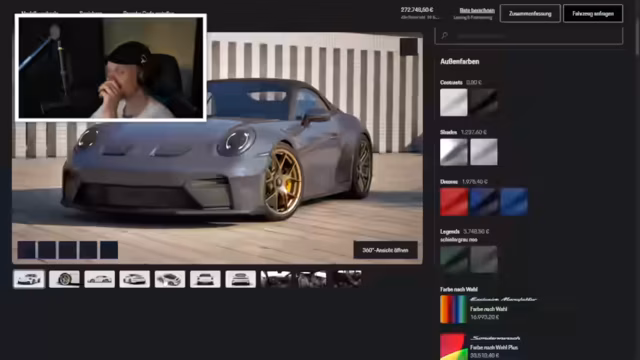 00:33:22Es geht um das Auto des Streamers, einen neuen Mercedes, den er nach sechs Monaten zurückgeben muss. Er ärgert sich über Kratzer und Schäden, die von Personen verursacht wurden, die kein eigenes Auto haben und es als normalen Gebrauchsgegenstand betrachten. Anschließend konfiguriert er einen Porsche GT3, wobei er verschiedene Farben und Ausstattungsoptionen in Betracht zieht und die hohen Preise für Sonderwaffen kritisiert.