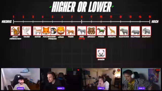 01:15:08Nach der ersten Quizphase startet das Spiel 'Higher or Lower'. Zuerst wird nach verkauften Spiel-Franchises gerankt, wobei Minecraft, die Sims und Pokémon die oberen Plätze belegen. Eine zweite Runde misst die durchschnittlichen Zuschauerzahlen auf Twitch der letzten 30 Tage. In der finalen Runde geht es um das Durchschnittsgewicht von Tieren, wobei überraschende Erkenntnisse über das Gewicht von Tigern und die Größenordnung von Eseln zu Diskussionen führen. Hugo gewinnt diese Runde.