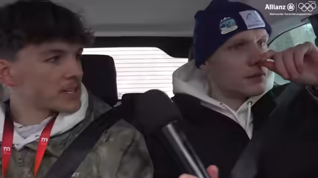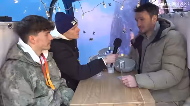 02:15:22Der Streamer und der ehemalige Skirennfahrer Felix Neureuther begeben sich in eine speziell eingerichteten Allianz-Gondel für ein olympisches Quiz. Das Motto lautet 'Live on Air' und die Gondel ist ausgestattet mit Mikrofonen und Kunstfell. Ein vorheriges Schnick-Schnack-Schnuck-Duell entscheidet über die Reihenfolge. Der Streamer startet mit einer 2-0-Führung und versucht, das breite olympische Wissen des Profis zu testen, während gleichzeitig der dramatische Verlauf des Quizes gezeigt wird.