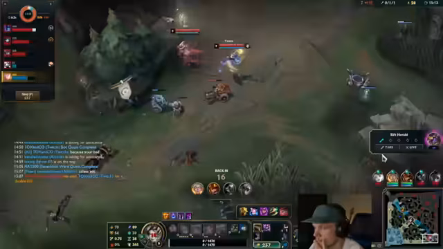 02:15:00Während des Spiels zeigt sich der Streamer frustriert über die gegnerische Yuumi, die er als übermächtig beschreibt. Er äußert, dass der Champion unverhältnismäßig stark sei und das Spiel unfaire machen würde. Gleichzeitig versucht er, sein eigenes Spiel zu verbessern und sucht nach Wegen, das Spiel zu beeinflussen.