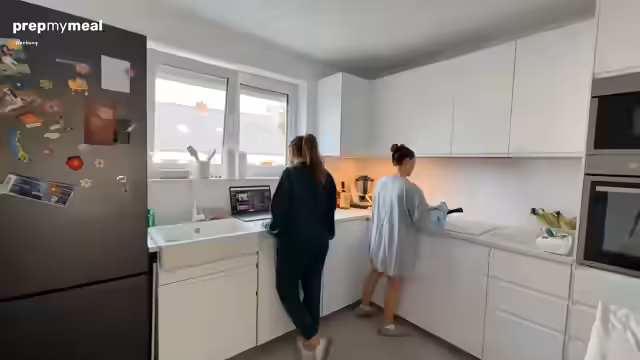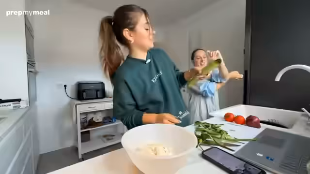 00:54:46Der Teig wird geknetet und die Streamerinnen loben den Thermomix dafür, dass er diese Aufgabe übernimmt. Sie überlegen, was Schlechtes über den Thermomix gesagt werden kann, kommen aber zu keinem Schluss. Pommes werden in den Airfryer gegeben und Gemüse wie Gurken und Tomaten geschnitten. Es wird überlegt, ob griechischer Joghurt in den Teig gegeben werden soll. Eine Streamerin erzählt, dass sie auf Malta fast jeden Abend gekocht oder gebacken hat. Die Streamerinnen sprechen über die POV-Ansicht beim Teigziehen und darüber, wie nahe sie dabei sind.